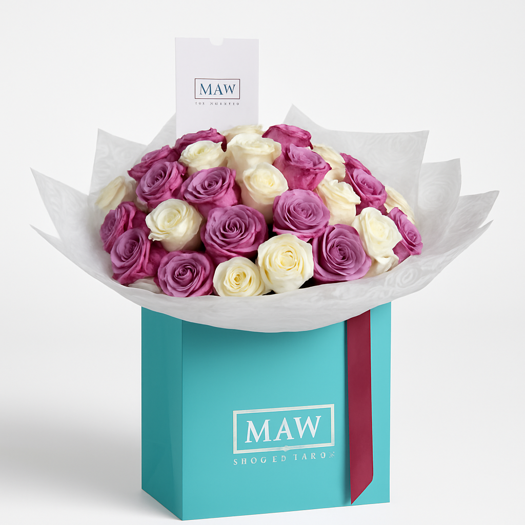 Beautifully wrapped in MAW’s signature floral-embossed white paper and presented in our luxury gift bag, this arrangement embodies sophistication at its finest. Perfect for heartfelt gestures, anniversaries, or adding a refined touch to any setting, Amethyst Grace is a true expression of elevated beauty.