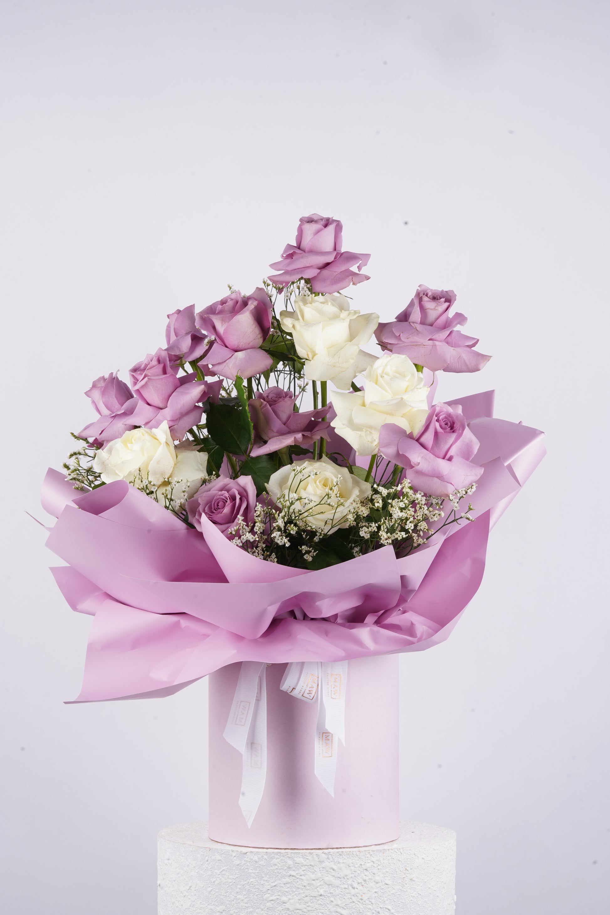 An elegant bouquet combining soft lilac and pure white roses in a graceful arrangement that reflects purity and sophistication.